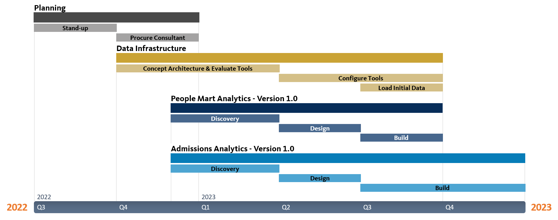 To ultimately enable UC Merced’s long-term analytic needs, The IDEA Project will design and launch data infrastructure through an incremental build-out approach. This institutional investment in shared data infrastructure will reduce the effort and resources needed today to perform analysis and develop reports.