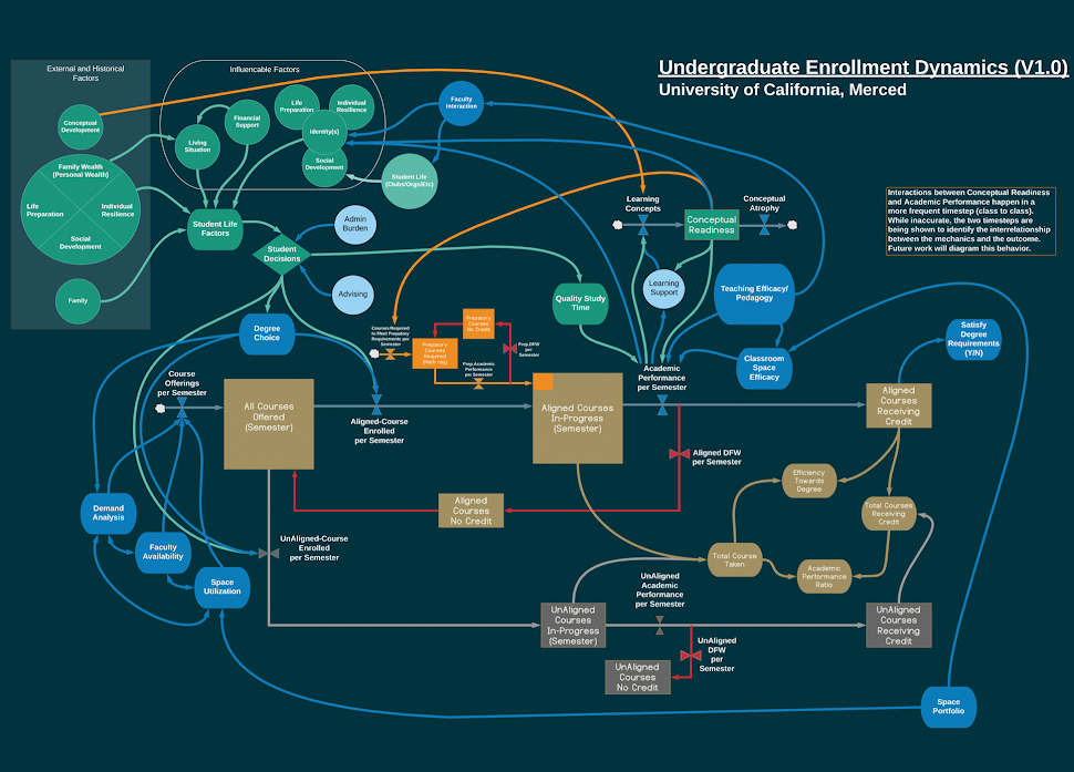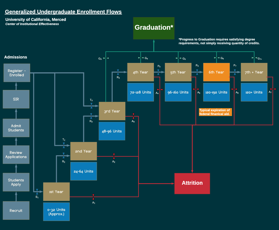 This model illustrates the process in which undergraduate enrollment occurs, stemming from recruitment and application all the way through levels (years and units) that lead to graduation.